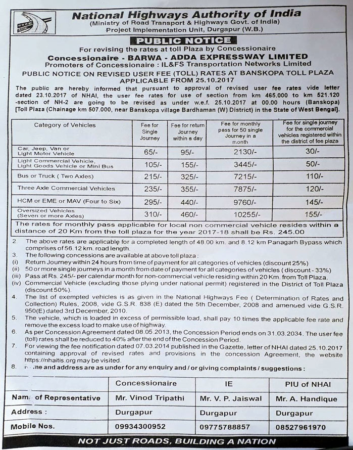 ২৫ অক্টোবর মধ্যরাত্রি থেকে চালু হচ্ছে ২নং জাতীয় সড়কে বাঁশকোপায় নবনির্মিত টোল প্লাজাটি। ১৯৯৮ সালে জাতীয় সড়ক সম্প্রসারণের সময় পানাগড়ে জাতীয় সড়কের কাজ থমকে যাওয়ায় সেই সময় বাঁশকোপার নির্মীয়মাণ টোল প্লাজাটি চালু করা সম্ভব হয়নি। ২০১৫ সালে ফের জাতীয় সড়ক ছয় লেনে সম্প্রসারণের কাজ শুরু হলে ২০১৭ সালে পানাগড় বাইপাস চালু হতেই জাতীয় সড়ক কর্তৃপক্ষ ফের বাঁশকোপার নির্মীয়মাণ টোলপ্লাজাটির অসম্পূর্ণ কাজ সম্পূর্ণ করে। জাতীয় সড়ক কর্তৃপক্ষ সূত্রে জানা গেছে ২৩ অক্টোবর জাতীয় সড়ক কর্তৃপক্ষের উচ্চ পদস্থ আধিকারিকদের উপস্থিতিতে সারাদিন ধরে ট্রায়াল চলার পর ২৫ অক্টোবর মধ্যরাত্রি থেকে চালু হচ্ছে টোলপ্লাজাটি। টোলপ্লাজা সুত্রে জানা গেছে এখানে যাত্রীদের সুবিধার্থে মান্থলি টোল পাশ ইস্যু করবে জাতীয় সড়ক কর্তৃপক্ষ। তাছাড়া ডেবিট ও ক্রেডিট কার্ড ব্যবহার করতে পারবেন যাত্রীরা টোল পারাপারের সময়। অপরাধ দমনে টোল প্লাজার চতুর্দিক সিসিটিভিতে মুড়ে ফেলা হয়েছে। টোল পারাপারের নির্দিষ্ট রেট চার্ট নিম্নে দেওয়া হলঃ