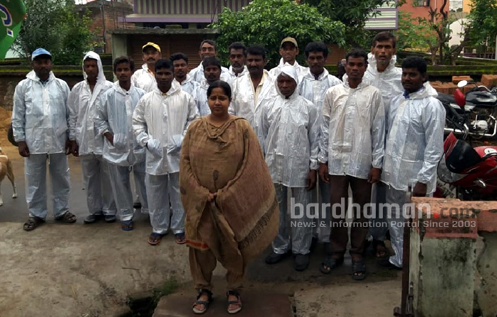 ডব্লিউবিইউজিএস প্রকল্পে কর্মরত কর্মীদের বর্ষায় কাজের উপযোগী বর্ষাতি উপহার দিলেন দুর্গাপুরের ১৪ নং ওয়ার্ডের কাউন্সিলর তথা স্বাস্থ্য দফতরের মেয়র পারিষদ রাখি তেওয়ারি। শুক্রবার নতুন পল্লীর দলীয় কার্যালয়ে স্থানীয় কাউন্সিলর তথা মেয়র পারিষদ রাখি তেওয়ারি ৩৬ জন কর্মীর হাতে রেনকোট তুলে দেন।