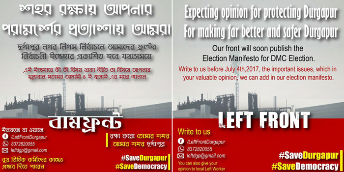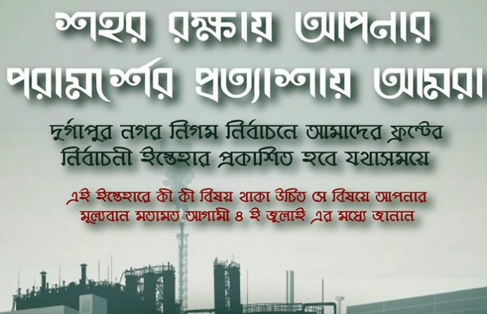 আসন্ন দুর্গাপুর পৌরসভার নির্বাচনে মানুষের মন জয় করতে দলীয় ইস্তাহারে জনগণের মতামত নিতে সোশ্যাল মিডিয়ার আশ্রয় নিল দুর্গাপুরের বামফ্রন্ট। এক সঙ্গে প্রচুর মানুষের কাছে পৌঁছতে “শহর রক্ষায় আপনার পরামর্শের প্রত্যাশায় আমরা”- আবেদন করে জনগণের মতামত চাওয়া হয়েছে ফেসবুক ও হোয়াটস্ অ্যাপের মাধ্যমে। শহর রক্ষায় নিকাশি ব্যবস্থা থেকে স্বচ্ছভাবে পৌরসভা চালনা সব কিছুরই সোজা-সাপ্টা জনগণের মতামত ও পরামর্শ চাওয়া হয়েছে সোশ্যাল মিডিয়ার মাধ্যমে। সাধারণ মানুষও তাদের মতামত প্রকাশ ও বিভিন্ন পরামর্শ দিচ্ছেন এই সোশ্যাল মিডিয়ায় বলে জানা গেছে। একই ভাবে এবার দুর্গাপুর পৌরসভা নির্বাচনের দেওয়াল লিখনেও পরিবর্তন আনতে চায় বাম দলগুলি। মানুষের দৈনন্দিন চাহিদাকে গুরুত্ব দিয়ে এবং নতুন প্রজন্মের ছেলে-মেয়েদের মন জয় করতে দেওয়াল লিখনও আকর্ষনীয় করতে চায় দুর্গাপুরের বাম দলগুলি। এই জন্য বিশেষজ্ঞদেরও পরামর্শ নেওয়া হচ্ছে বলে জানা গেছে। এক সময় বামফ্রন্টের প্রবীণ নেতারা ও অর্থনীতিবিদরা দলীয় কার্যালয়ের চার দেওয়ালের মধ্যে বসেই নির্বাচনী ইস্তাহার তৈরি করতেন। দেওয়াল লিখনেও একই বার্তা প্রতিফলিত হত। কিন্তু ২০১১ সালে রাজ্যে নির্বাচনী পালা বদলে ক্ষমতা হাত ছাড়া হওয়ার পর বামফ্রন্টের নতুন প্রজন্ম সামনের সারিতে আসায় পুরানো সব ধ্যান ধারণা বদলে ফেলে মানুষকে গুরুত্ব দিয়ে সোশ্যাল মিডিয়ার মাধ্যমে জনগণের মত চেয়ে দলীয় ইস্তাহার প্রকাশ করতে চলেছে। আসন্ন দুর্গাপুর পৌর নির্বাচনে বাম ফ্রন্টের এই কৌশল শাসক দল তৃণমূল কংগ্রেসকে নিসন্দেহে কিছুটা হলেও বেগ দেবে বলে ওয়াকিবহাল মহলের ধারণা।